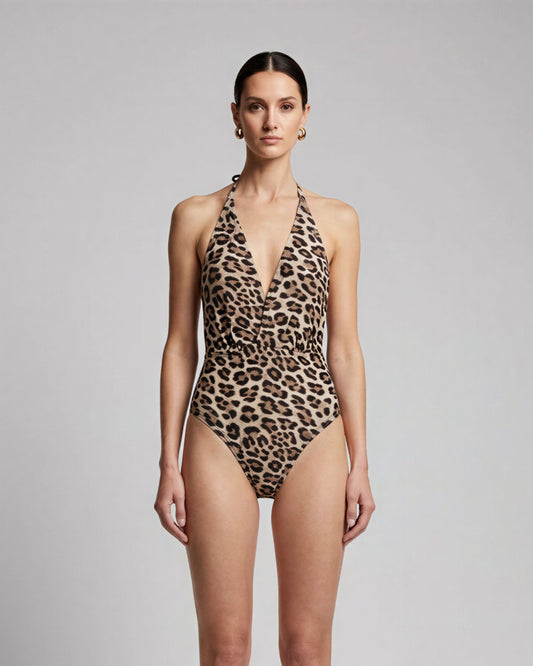 XENA LEOPARD BROWN WOMENS HALTER ONE-PIECE SWIMSUIT