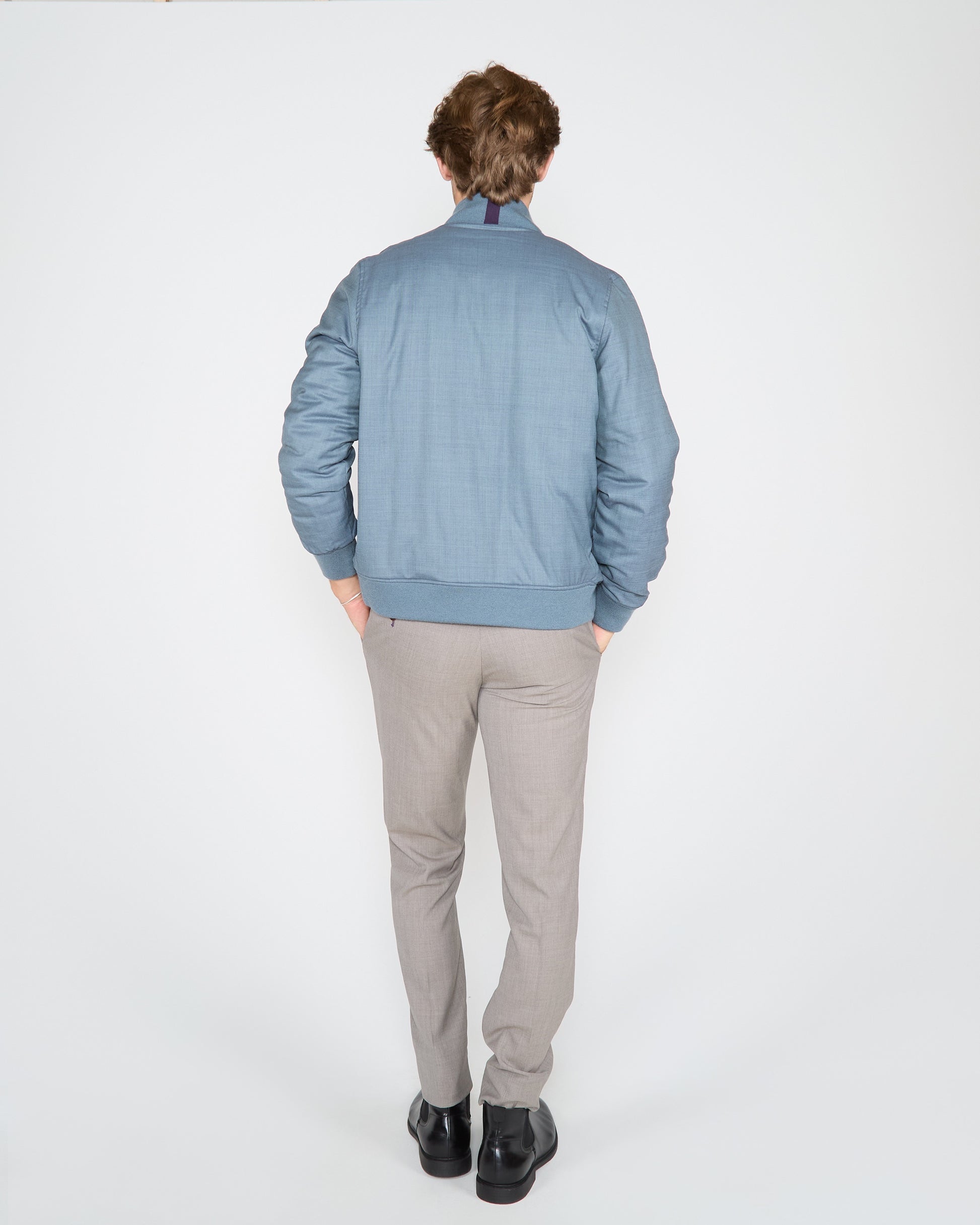 Treat yourself to our exquisitely crafted blouson jacket. Made with a 100% tropical wool on one side and quilted polyester on the other, this reversible jacket offers both style and versatility. The quilted knit collar, cuffs, and hem provide additional comfort and warmth, while the two convenient lower pockets on each side offer practicality. Elevate your wardrobe with this timeless piece.