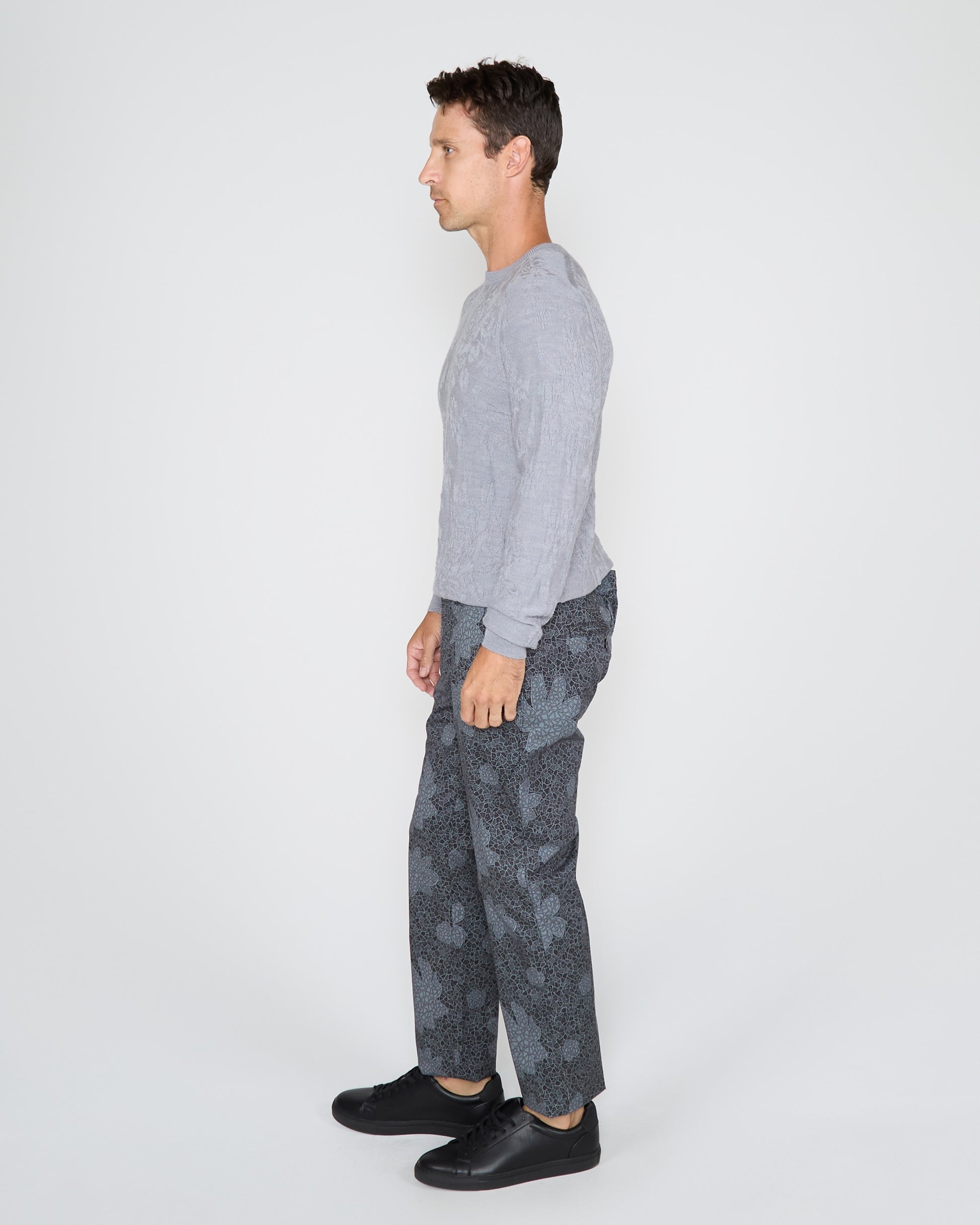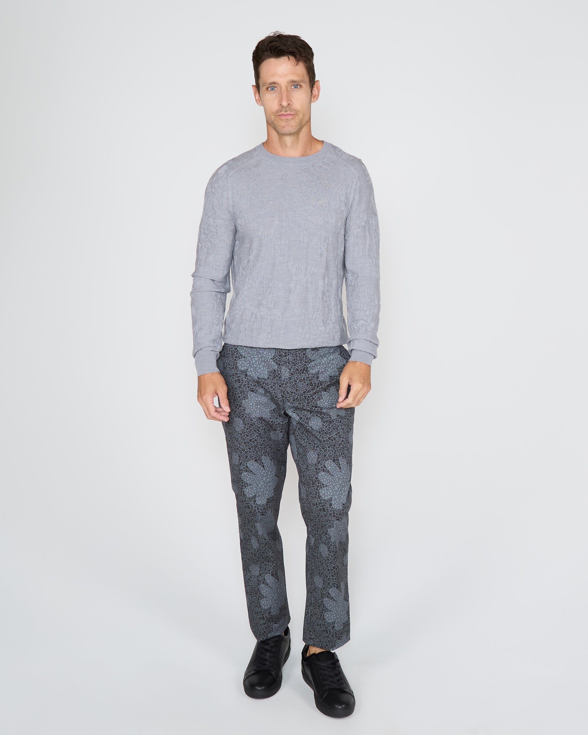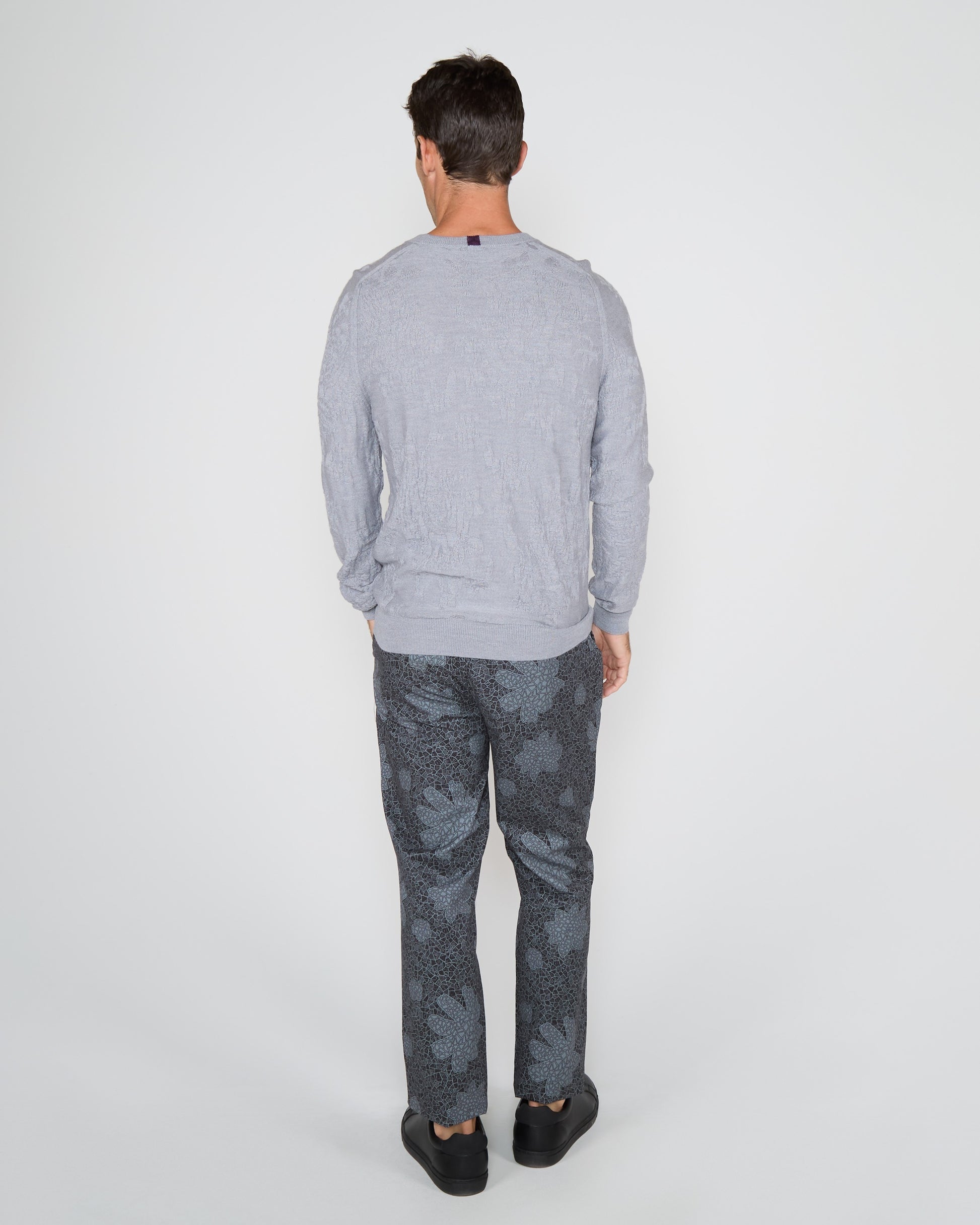 Step up your sweater game with this luxurious paisley crew neck. Crafted from a blend of superfine merino, silk, and cashmere, it boasts a saddle shoulder, ribbed details, and a signature polkadot stripe at the collar's back. Elevate your wardrobe with this elegant, textured piece.