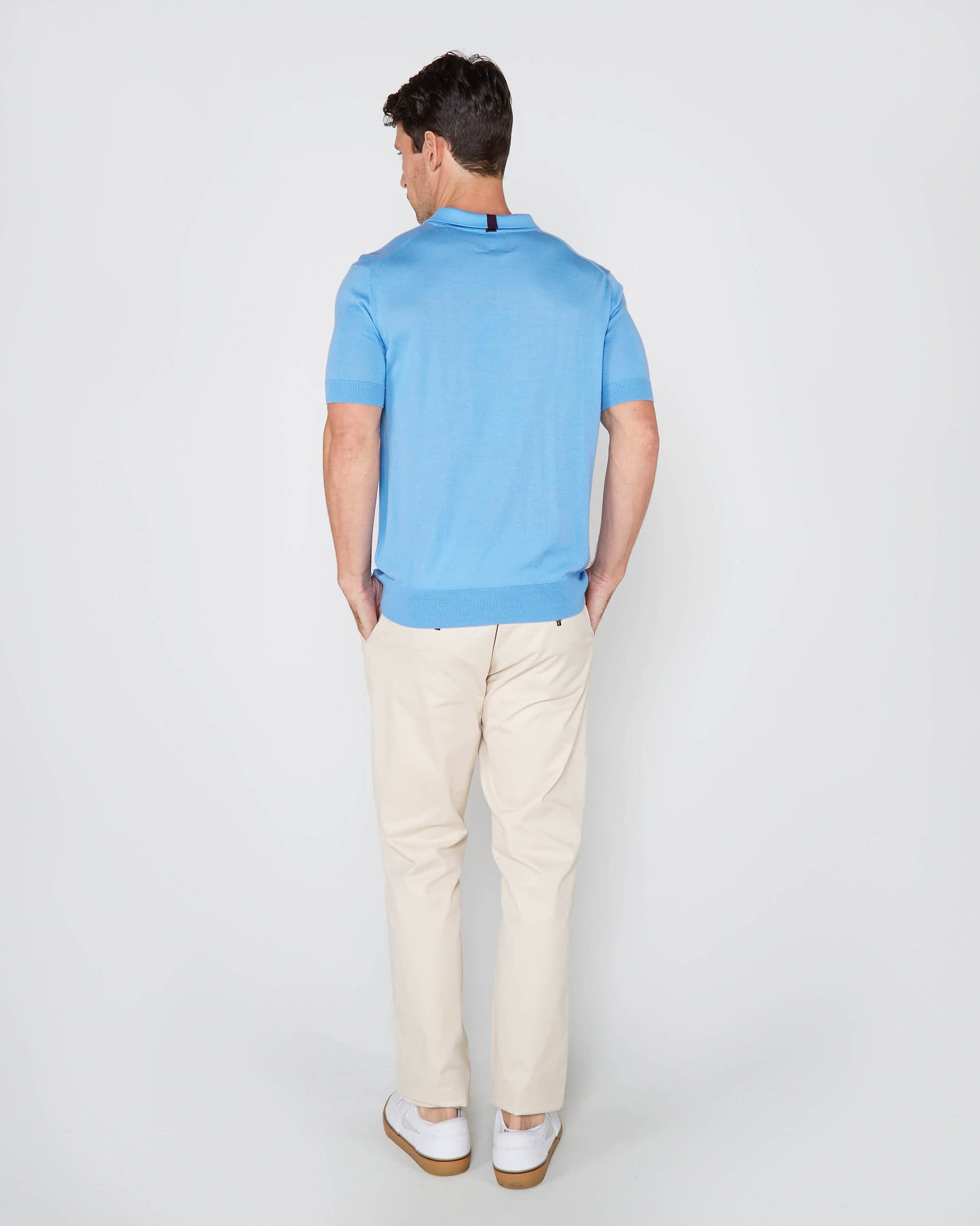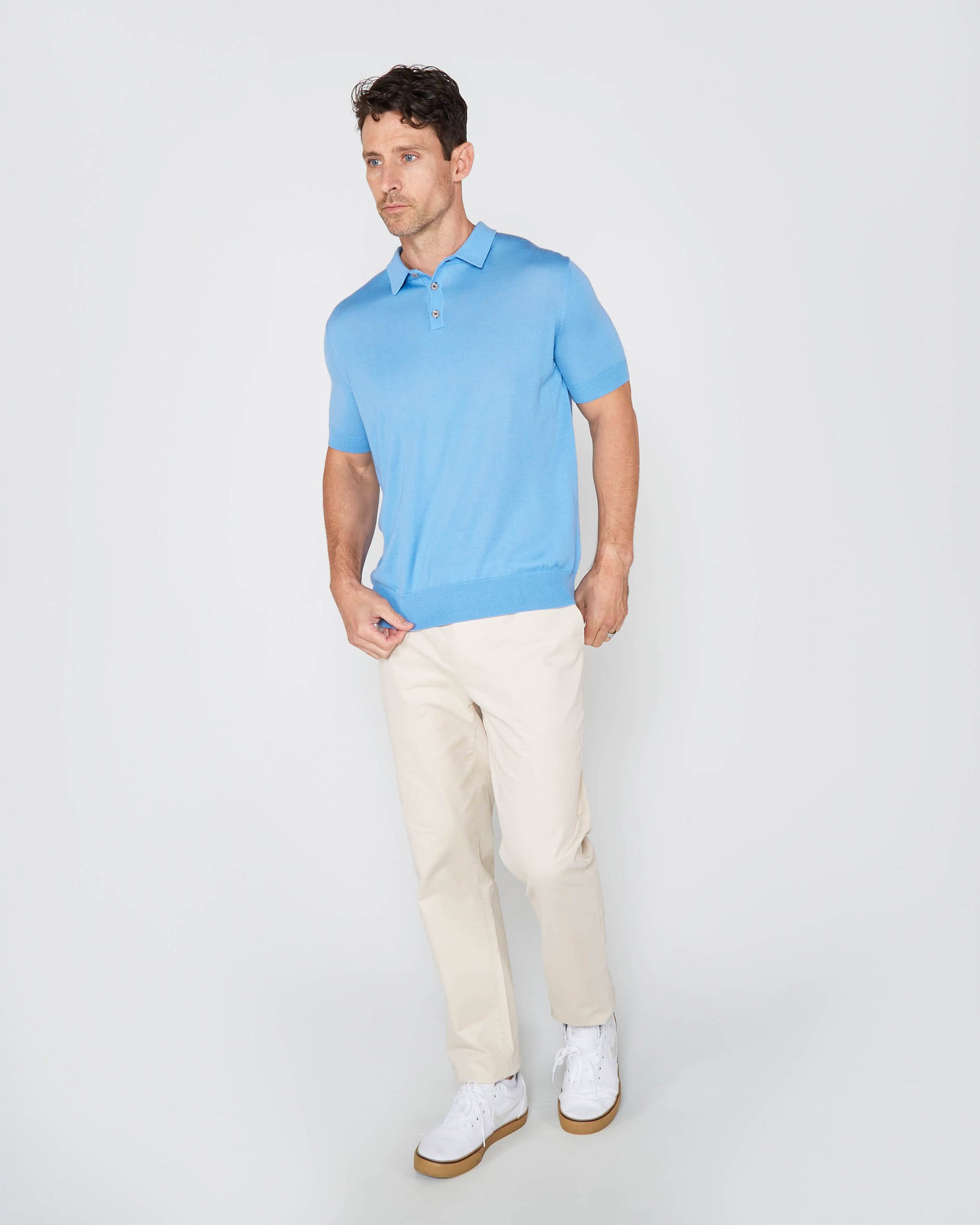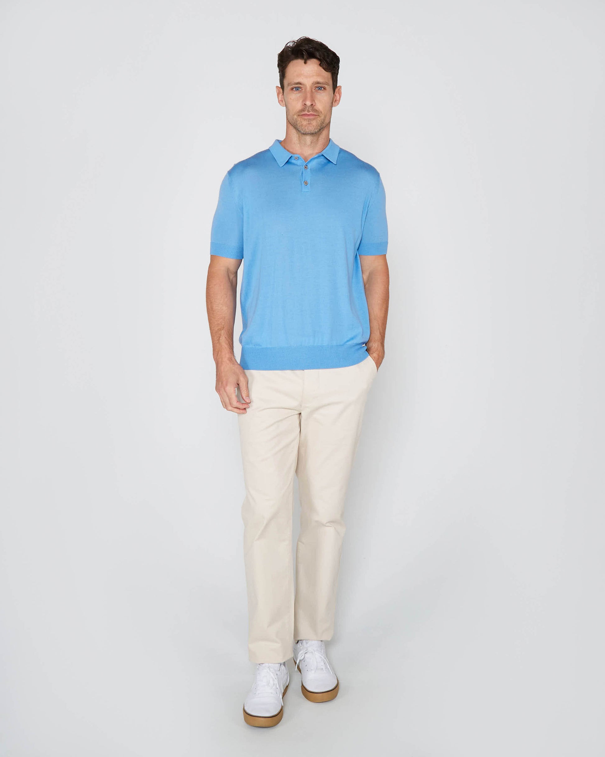Our Pilgrim polo is made of 70% ultrafine merino, 20% silk, and 10% cashmere... which means it is extremely soft and lightweight! The fine yarns allow this sweater knit to breathe and stretch, giving you supreme comfort. Look closely and see the contrasting ribbed hem for an extra touch of love.