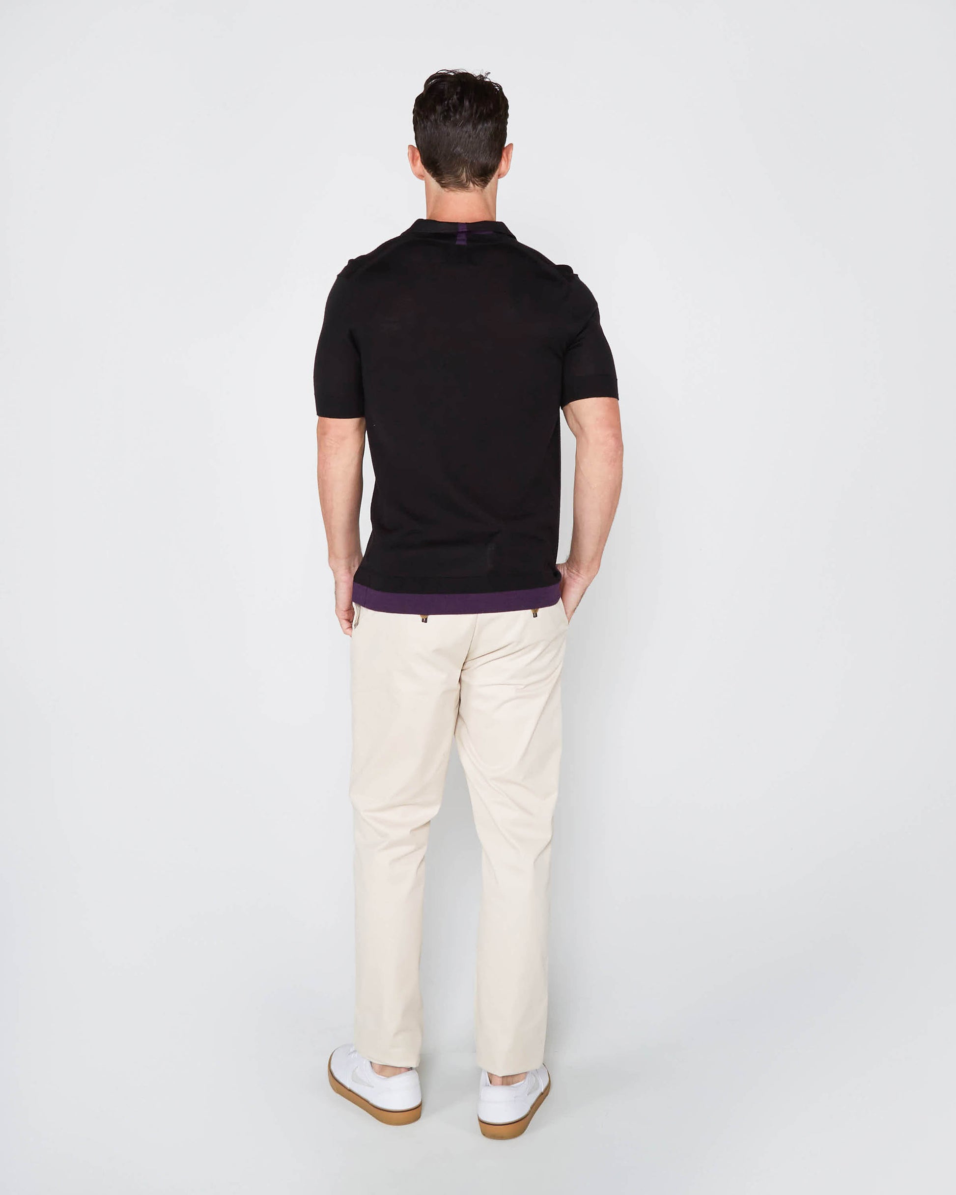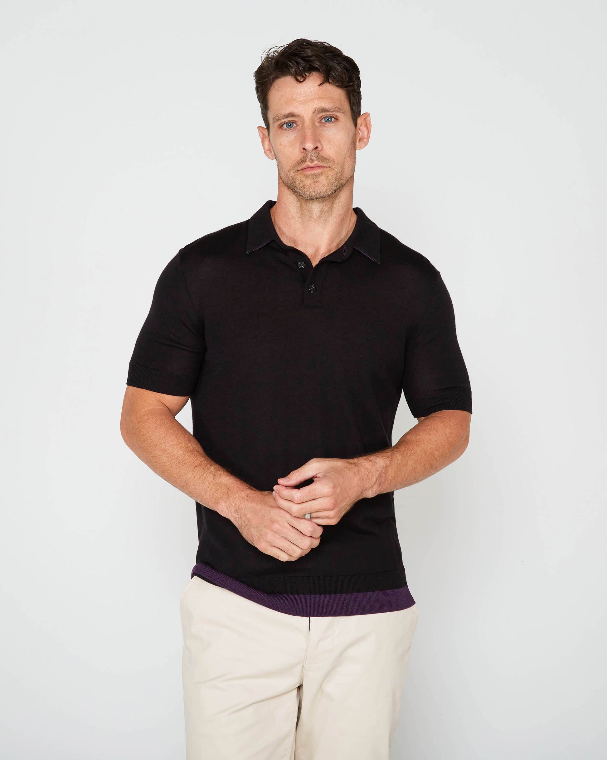 Our Pilgrim polo is made of 70% ultrafine merino, 20% silk, and 10% cashmere... which means it is extremely soft and lightweight! The fine yarns allow this sweater knit to breathe and stretch, giving you supreme comfort. Look closely and see the contrasting ribbed hem for an extra touch of love.